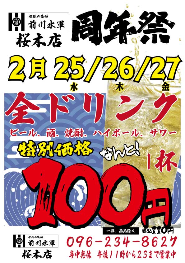 2/25〜27まで 前川水軍桜木 ドリンク100円祭り 公開済み: 2026年2月19日更新: 2026年2月21日作成者: johsmile2018カテゴリー: イベント, オススメ 日頃よりジョー・スマイル各店をご利用いただきありがとうございます。 2/25~27の3日間、前川水軍桜木にて周年際を開催いたします。 全ドリンクが1杯110円にて提供いたします。(一部商品を除く) みなさまのお越しを楽しみにお待ちしております。 関連記事 麦うさぎ 大周年祭 8月22~23日の2日間 8月22~23まで、麦うさぎ 大周年祭 麦うさぎ 大周年祭 開催! 8月22日(火)~ 8月23日(水) ・ドリンク全品100円 日頃の感謝を、麦うさぎで一番の笑顔でお届けいたします。 公開済み: 2023年8月1日更新: 2023年8月28日作成者: johsmile2018カテゴリー: Coming soon, イベント, オススメ, お知らせ, ご報告, 周年祭, 麦うさぎ 05 7/16〜18 前川水軍桜木 周年祭開催 日頃よりジョー・スマイル各店をご利用いただきありがとうございます。 7/16〜18の3日間、前川水軍桜木店にて周年祭といたしまして、ドリンク100円(税込110円)のキャンペーンを開催いたします。 大変お得なイベントとな […] 公開済み: 2024年7月5日更新: 2024年7月31日作成者: johsmile2018カテゴリー: イベント, オススメ, 前川水軍桜木店 「前川珈琲 光の森合志店」周年祭 10/23(水)~10/25(金) 「前川珈琲 光の森合志店」はこの度、一周年を迎えることができました。これも皆様方からのご支援、ご愛顧の賜物でございます。つきましては、日頃の感謝も含め「周年祭」として10月23日(水)から10月25日(金)迄の3日間、「 […] 公開済み: 2019年9月27日更新: 2019年11月1日作成者: johsmile2018カテゴリー: イベント, オススメ, お知らせ, 前川珈琲店光の森合志店, 周年祭